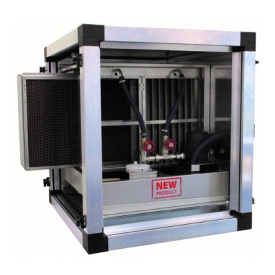 Humidificador com painel evaporativo, converte eficientemente água em vapor de água, usando um processo adiabático